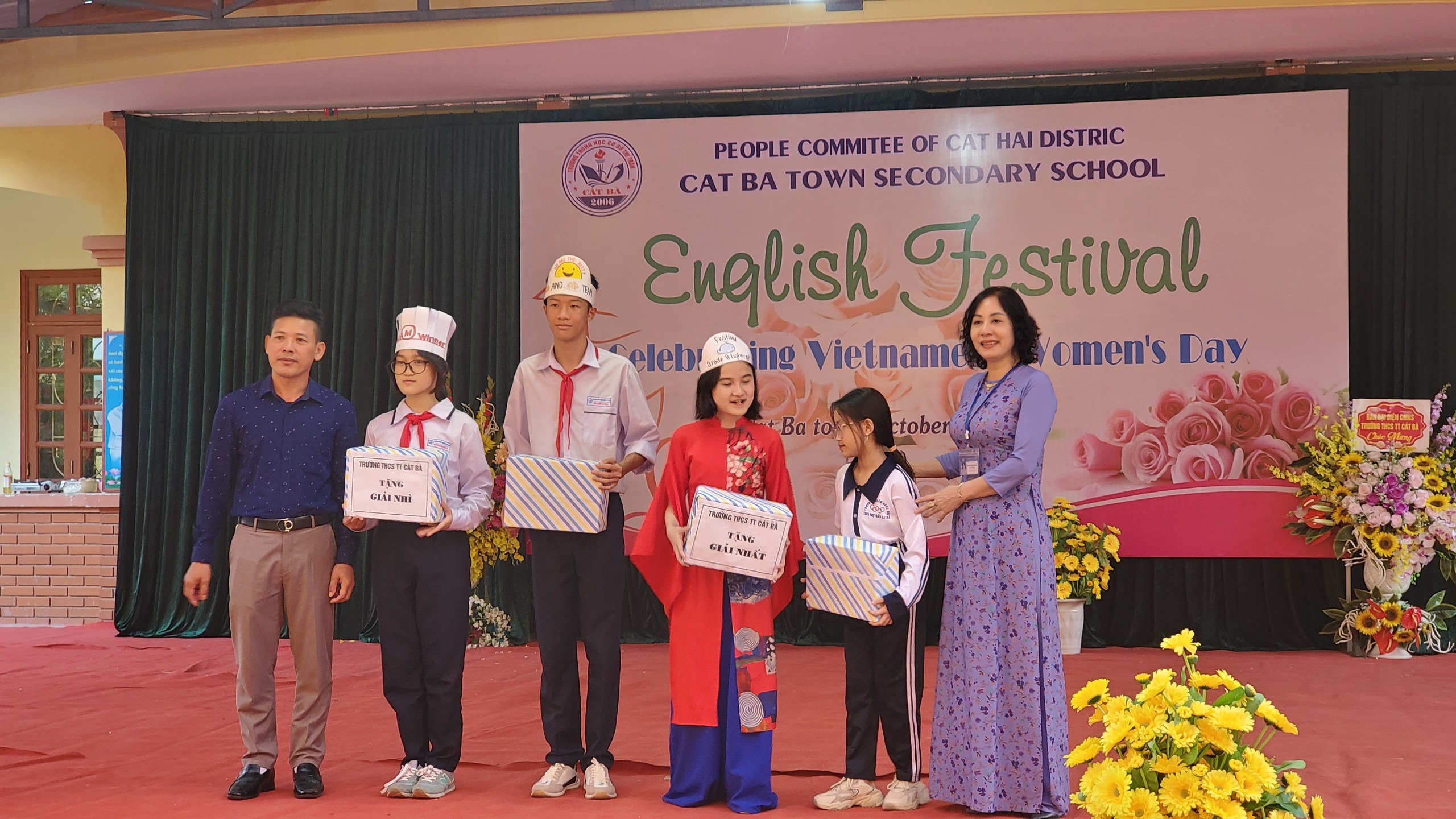 Với mục đích góp phần phát triển kĩ năng Nghe – Nói Tiếng Anh và khả năng tư duy cho học sinh, tạo không khí học tập ngoại ngữ phổ biến, sôi nổi, thoải mái ở các khối lớp trong nhà trường, tạo điều kiện cho học sinh có môi trường để trao đổi, học hỏi, trau dồi kiến thức tiếng Anh, ứng dụng tiếng Anh vào cuộc sống hàng ngày, mạnh dạn, tự tin khi giao tiếp bằng tiếng Anh, xây dựng cho các em ý thức tự học, khích lệ niềm say mê khi học tiếng Anh. Chiều ngày 18/10/2022 Trường THCS thị trấn Cát Bà tổ chức Ngày hội tiếng Anh cho học sinh “English Festival-Celebrating Vietnamese Women's Day 20/10”